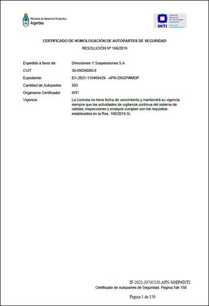 Certificar Nuestros Productos a través de INTI, logrando la homologación CHAS para Autopartes de Seguridad desde Abril de 2016.